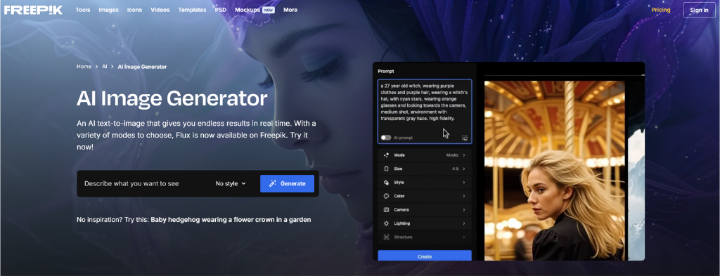 • Multiple AI Models: Choose from a range of AI models tailored to your project, including the efficient Flux Fast and Freepik’s flagship model, Mystic.