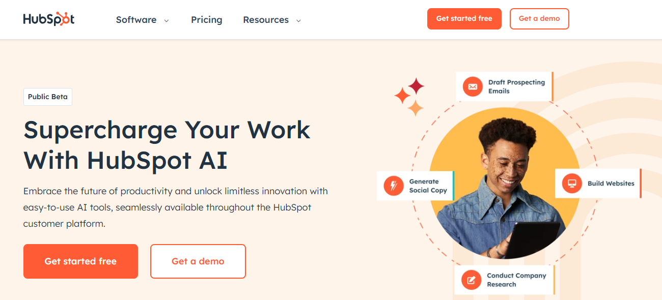 • Website Generator: Make complete one-page websites with just a few prompts. Use HubSpot’s drag-and-drop builder to further customize the output based on your needs.