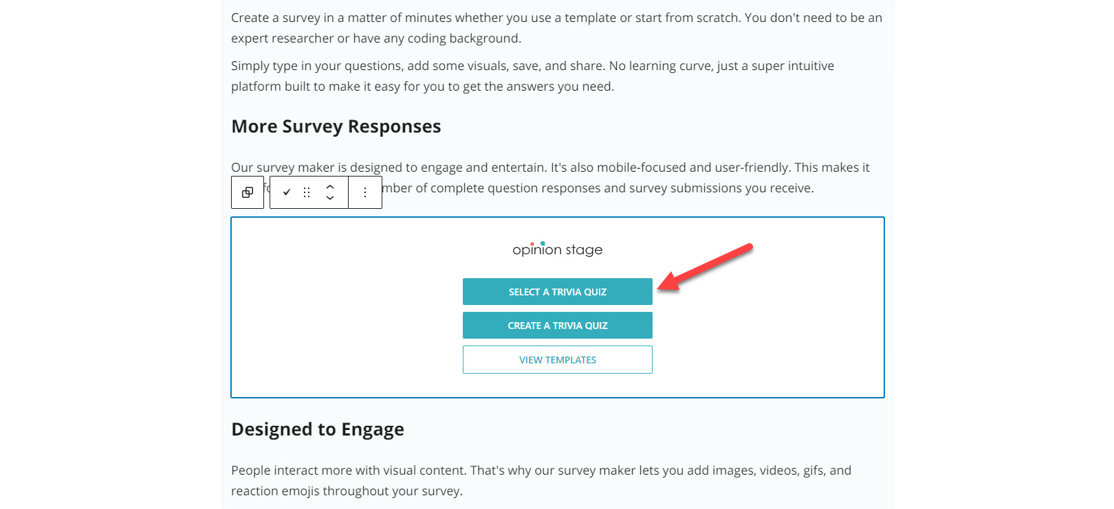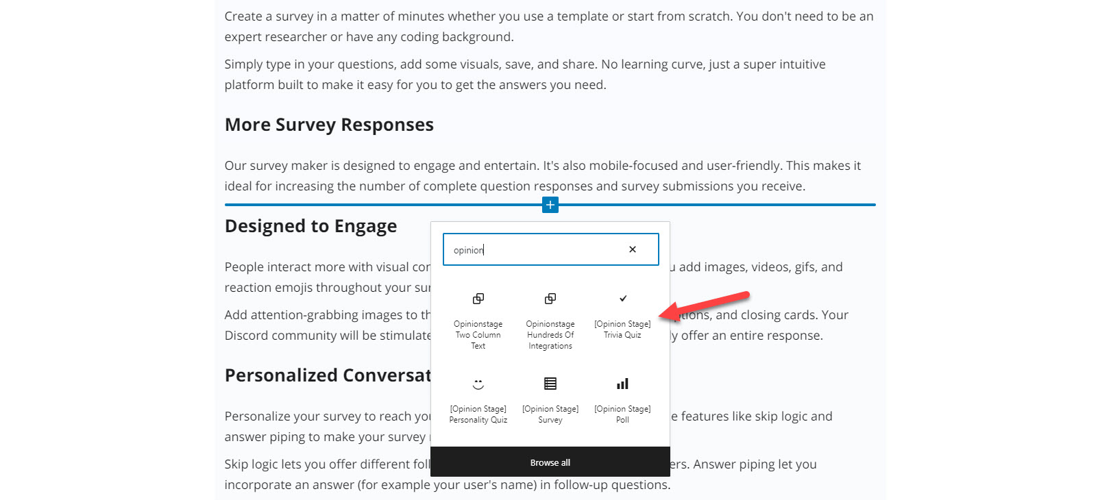 Click on the “+” to add a new block and search for Opinion Stage Quiz maker.